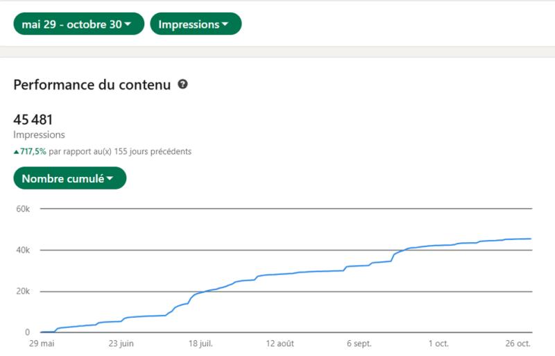 Ma collab avec Mme F. est un vrai régal : dès le début , on a commencé à tester les thématiques et les sujets , on a su ce qui plaisait le plus à son audience ( entre la Tunisie et les Emirats Arabes Unies). Avec son authenticité et son ouverture d'esprit , on a pu avancer très rapidement. Voici les chiffres après 5 mois de publications ( 1 posts / semaine)